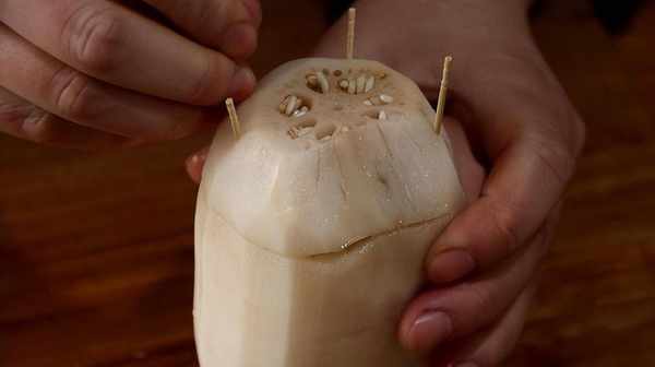 5、 将刚刚切下来的藕盖 用牙签固定在藕节上面;