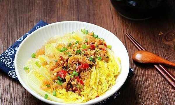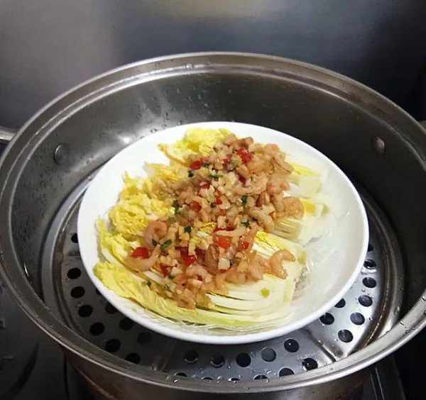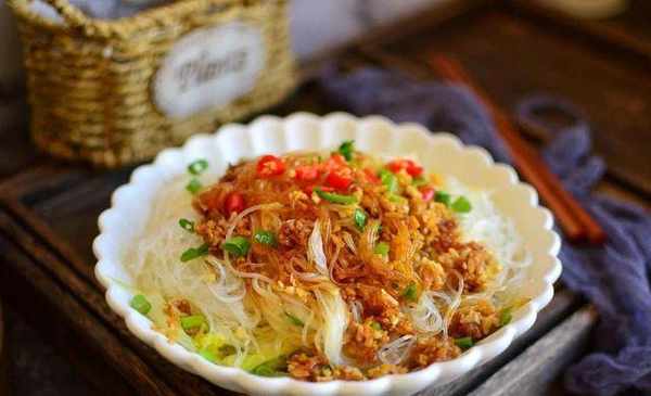 然后铺上一把泡好的粉丝,撒点海米,水开上锅蒸上五分钟,蒸好之后倒掉蒸出来的水分,淋上一圈生抽,放上点蒜末葱花,爱吃辣的来点辣椒段,烧点热油炸香后就可以吃了,营养丰富,新鲜好吃,多吃不把医生找,记得做哦。