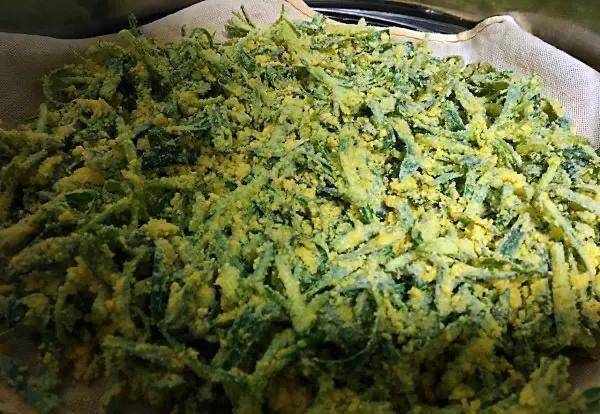 面条菜摘掉老根,摘洗干净之后控干水分,撒上点盐,打上一个鸡蛋,充分的拌匀,然后再撒上面粉,充分的拌匀,接着篦子刷上一层油,把面条再下锅,蒸上三分钟,
