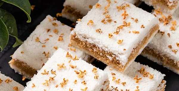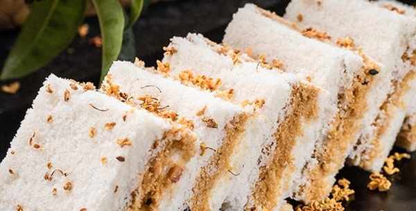然而桂花糕的製作順序也是非常麻煩的,要經過蒸、拌、擀等工序,出籠後先是有一股桂花的清香飄過來,剛出籠的桂花糕晶瑩白亮,咬一塊塞進嘴裡,軟軟糯糯的,口感細膩到化渣,最後回味時還有有一些甜絲絲的香味和微微的清凉,吃完之後滿嘴都會是桂花香。