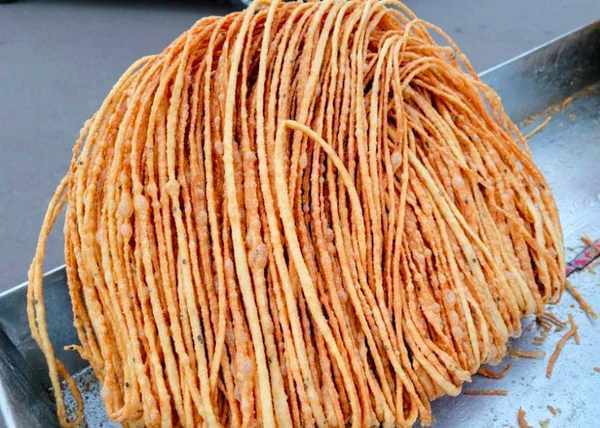 馓子的做法:面粉500克,加入盐7克、凉水250克,调制成面团反复揉,揉好的面团分成小块,先拉长,然后搓成筷子粗细的圆长条,再盘成数层,拉细,用筷子撑开,放入油锅里炸至金黄酥脆即可。