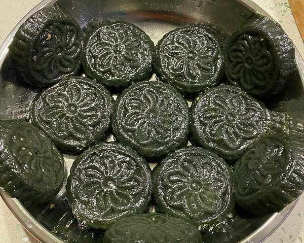 鸡屎藤饼的做法:新鲜的鸡屎藤叶洗净打成汁,搭配上糯米粉、一定比例的橙粉、粘米粉混合拌匀,揉成团,包入自己洗净的馅料,用模具压成自己喜欢的花样,沸水上锅蒸10分钟左右即可。