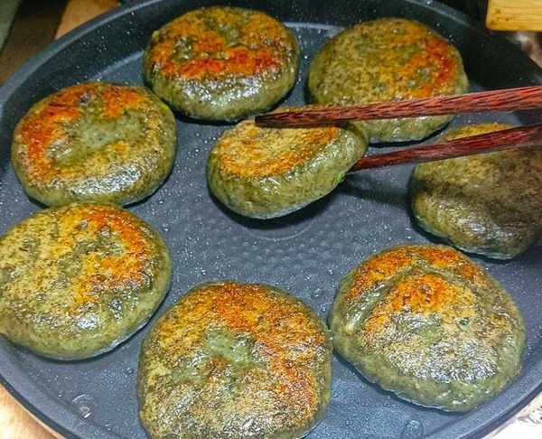 详细做法:新鲜的艾草洗净焯水打成艾草汁,艾草汁倒入糯米粉和粘米粉混合的粉里揉成团,包入自己喜欢的馅料压扁,然后放在平底锅里煎或者放在电饼铛里煎至两面焦黄熟透即可。