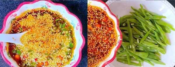 2、接着准备一碗酱料,碗中放葱花、小米椒、芝麻、热油、生抽、食盐混合。将做好的酱汁倒在豆角中。