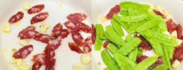 2、接着热锅爆蒜香,倒入切片的香肠,稍微炒出油水。再倒入焯水好的荷兰豆。