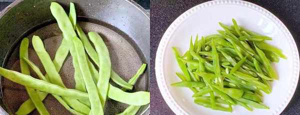 1、准备钣金荷兰豆,头尾掰下,洗干净。然后下锅焯水半分钟捞起。