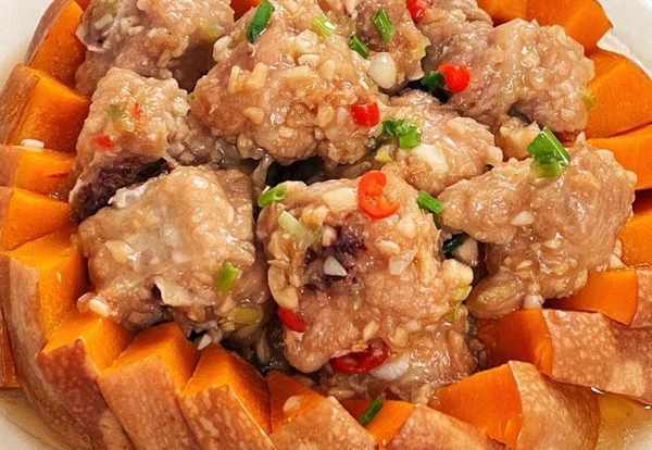 4、南瓜清洗干净,再切成厚一点的片,摆放在盘中围成一个圈,再放上腌制好的排骨,水开上锅蒸半个小时。