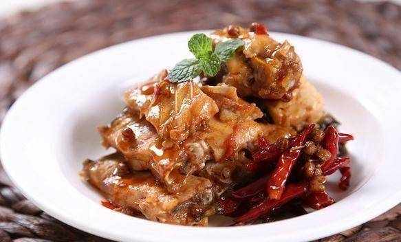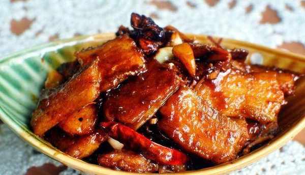 锅中留油,油热后倒入干红辣椒、葱姜爆香。倒入炸好的带鱼,加入生抽、老抽、耗油、盐、白糖翻炒均匀。