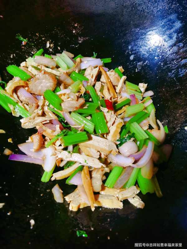 锅中放油,油热后放入肉片,炒至肉片焦黄后,放入洋葱,香干和芹菜,加入盐、生抽、老抽、蚝油、孜然,一起翻炒至食材熟透即可,这样一道美味又好吃的芹菜香干炒肉片就做好了。