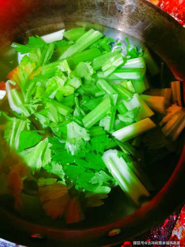 芹菜清洗干净后切段,放入盘中备用,猪肉清洗干净切片,香干清洗干净切丝,锅中烧水,水开后放入芹菜段和香干进去焯水至芹菜断生,捞出控干水分即可。