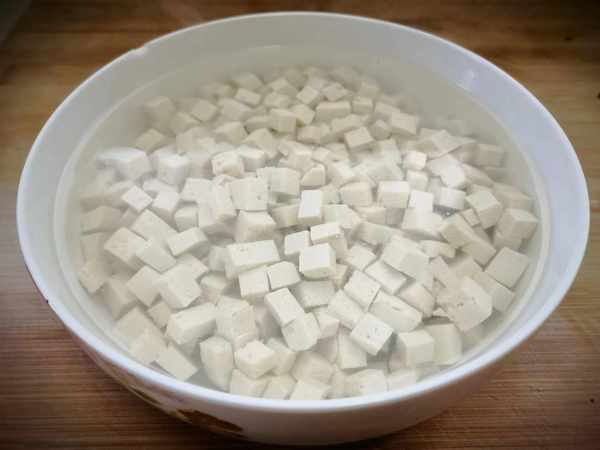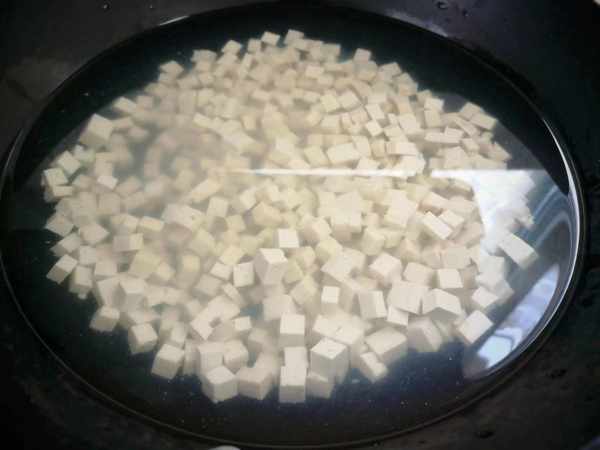 3、锅内加水,加入少许的盐,凉水下入豆腐,凉水下锅煮豆腐可以更好去除豆腥味。