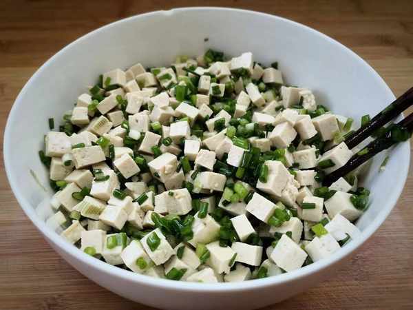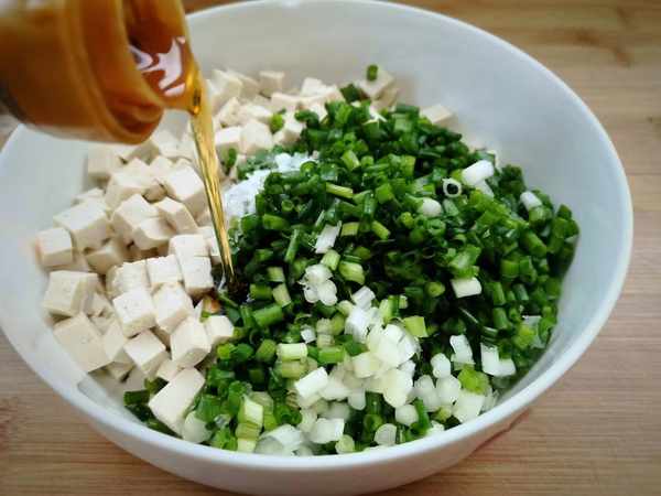6、豆腐控水后倒入盆中,放入葱花,放入1小勺盐,少许味精,淋入少许香油,不加香油就淡而无味了。
