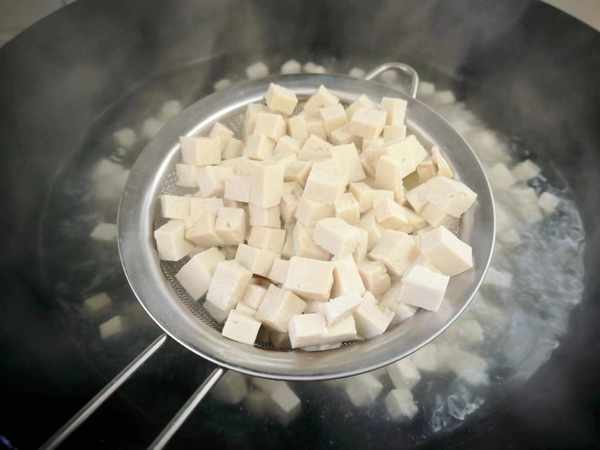 4、锅中水开后,用勺子撇去表面浮沫,搅动煮2分钟豆腐立即捞出。