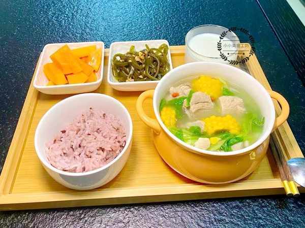 排骨玉米青菜汤,有肉有菜有碳水,这一锅营养就很丰富了。再加上凉拌的海带丝,搭配主食紫米饭,鲜香可口又下饭。紫米饭煮之前要浸泡下,节省时间,煮出来软糯不夹生。最后是木瓜和纯牛奶,补充维生素和蛋白质。