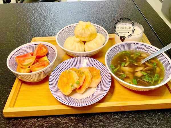 虾仁饼,优质蛋白的来源,吃起来鲜香可口,外焦里嫩,孩子特爱吃。这道菜做法很简单,将大虾处理干净后加入料酒,食盐和黑胡椒粉腌制片刻,然后搅打成泥,加入杂蔬粒拌匀,接着团成小饼下锅煎熟即可。小肉包是提前做好放在冰箱冷冻的,每次吃的时候拿出来热一下就可以,省时省力。香菜口蘑汤也是孩子的最爱,口蘑煎出汁水后,加入清水煮开,撒入少许胡椒和食盐调味,出锅前淋上一把香菜即可。最后是水果小柿子和纯牛奶,补充维生素和钙质,营养均衡的一餐。