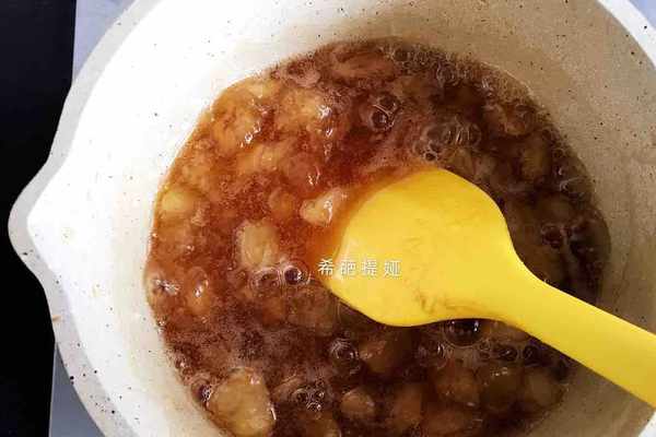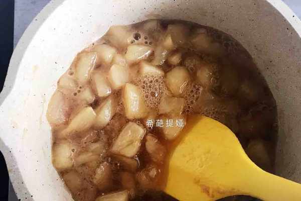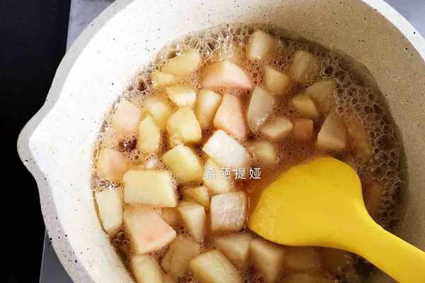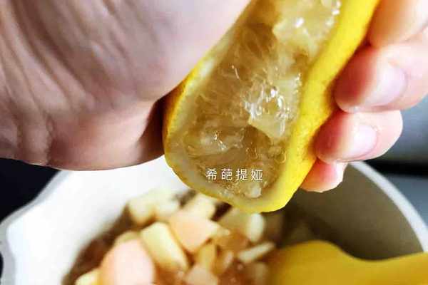 3.將桃肉和冰糖稍加攪拌後,擠入檸檬汁,並持續邊小火加熱邊攪拌