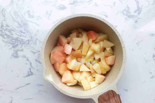 1.水蜜桃洗淨去皮,再切成小塊,取400g果肉放入小鍋內
