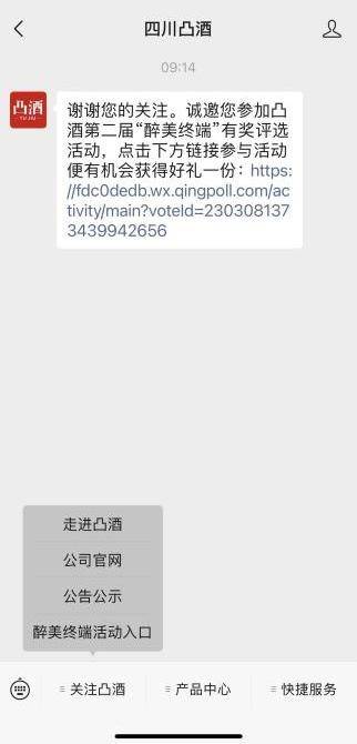 关注【四川凸酒】官方服务号,点击提示链接。也可点击左下方{关注凸酒},进入{醉美终端活动入口}。