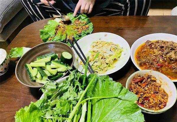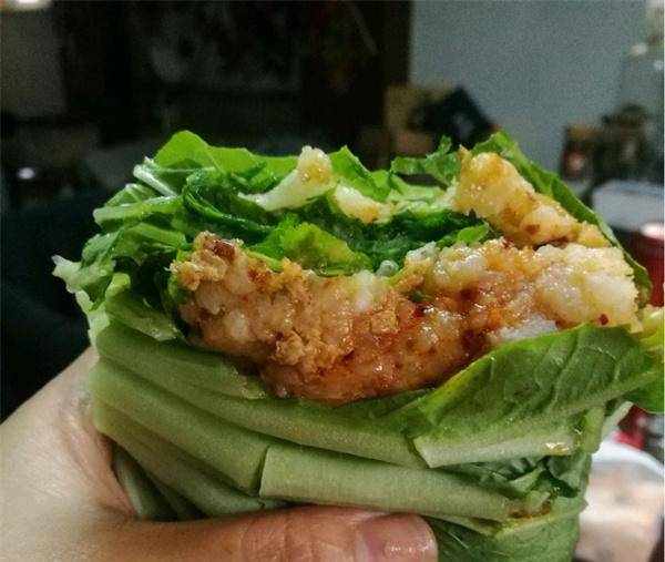 菜,选用的是新鲜的大生菜叶,也可以用脆甜的白菜叶和卷心菜叶。在米饭里加上土豆泥、辣椒酱,再根据客人口味加上蒜片、香肠、肉等菜品,最后卷起来就可以吃了。卷的方法随意,能兜住所有饭菜即可,卖相可能不太好,但香是真的香。