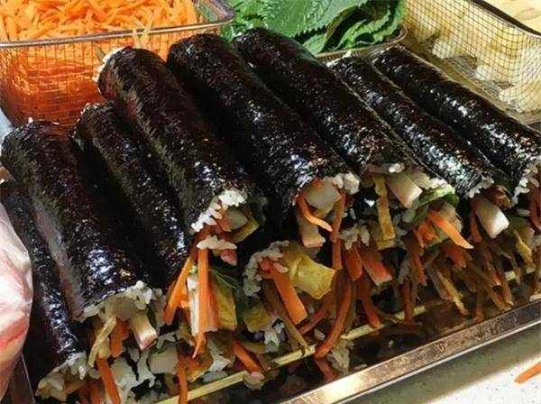韩国人,把米饭做成紫菜包饭,要说明的是紫菜包饭和寿司完全不一样,最起码食材没有寿司那么丰富多彩,价格也没有寿司那么昂贵。紫菜包饭最早来源于家庭式便当,米饭调味后,把黄瓜、蟹肉棒等简单食材包起来卷成卷,像卷饼一样。