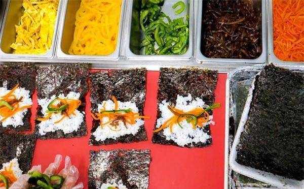 和寿司对比起来,紫菜包饭显得更粗糙,但也更平民,荤素搭配,口味没有过多讲究,喜欢吃什么都可以包进去。最开始是没有切的,整条方便携带,后来商业化后,才在出售时切成一口大小,方便食用。