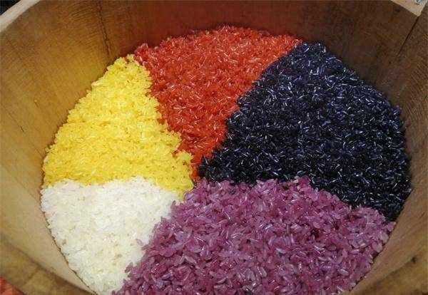 将大米或糯米放入水中浸泡,等到米粒完全变色后取出淘洗干净,蒸熟后即可食用。每一份糯米饭都选取五种颜色摆放,寓意五谷丰登、吉祥如意,是逢年过节、大小喜事拿来待客的最上乘礼仪。