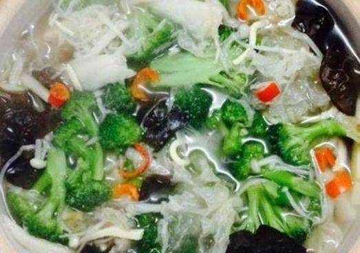 材料:西兰花适量、蘑菇适量、杏鲍菇1个、金针菇1袋、滑子菇、黑木耳、白木耳适量、干香菇适量、土豆1个、鸡架子1个