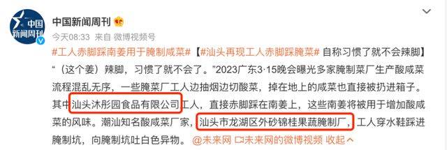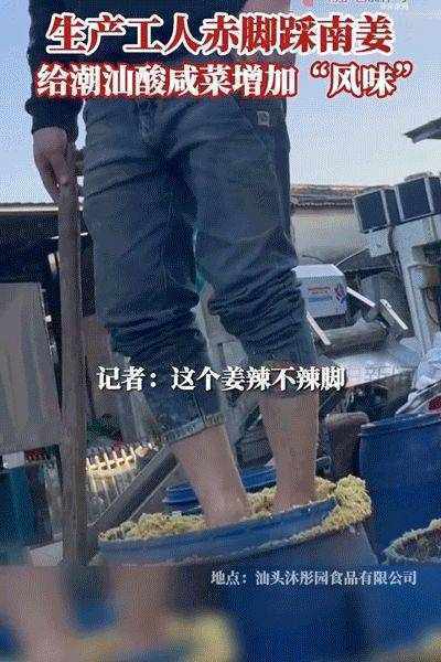 生产工人赤脚踩南姜,给潮汕酸咸菜增加“风味”,这画面是足够“辣眼睛”。
