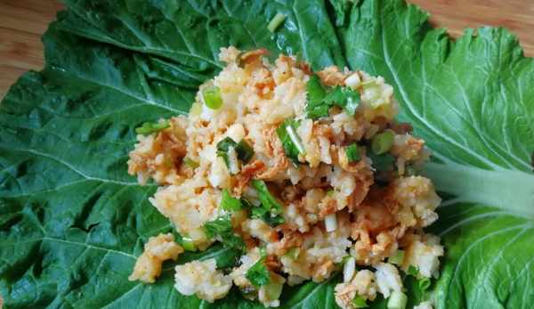 打飯包當地人習稱"飯包子",它的主要原料是大米,小米,大白菜葉(或幹豆腐)、香菜、小葱等。取一張白菜作為外皮,在上面抹上一層大醬,放上想吃的那些食材,最後放上米飯,再將菜葉聚攏團好,一份打飯包就製作完成了,極具農家風味。