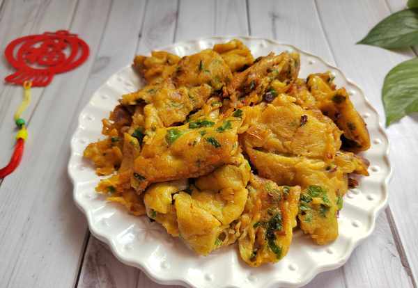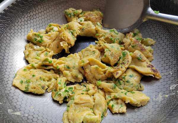 第五步:起锅烧油,倒入红薯粉蛋液,中火煎至凝固后,用锅铲分成小块。家里有平底锅的朋友们,也可以煎成薄饼卷着吃,我一般都是一锅煎,比较省时间。