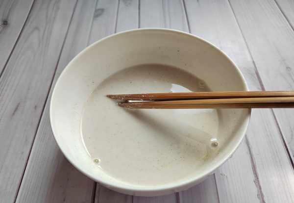 第三步:在红薯粉中加入清水拌匀,再加入盐和十三香拌匀。红薯粉和清水的比例是1:1,放多少红薯粉就加多少清水。