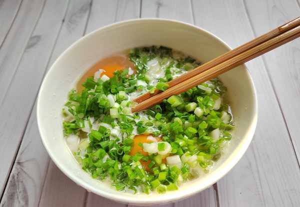 第四步:打入鸡蛋,加入切好的葱花,搅拌均匀。