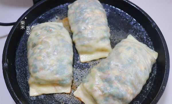 3,这个菜卷不是发面的,中间可以打开锅盖,查看一下菜卷底部情况,不要煎糊了。