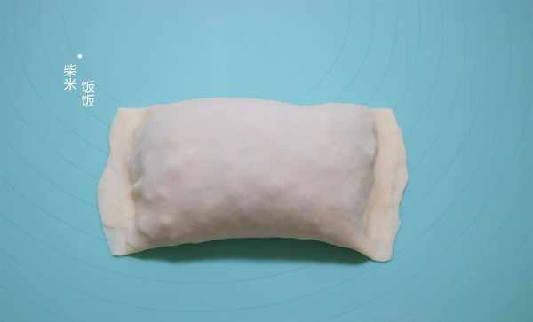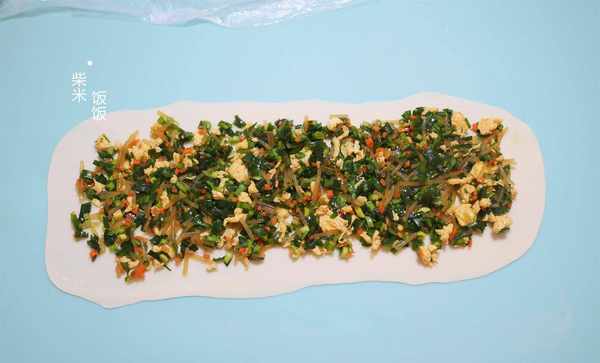 7,擀成长方形的薄面皮,再放入馅料,铺平。