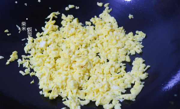 2,鸡蛋打入碗中,充分搅散。热锅凉油,倒入鸡蛋液,开大火用筷子快速滑炒。将鸡蛋炒熟炒碎关火,冷凉备用。