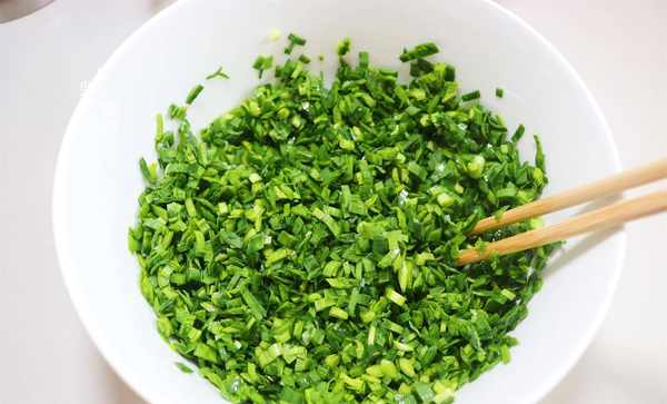 4,洗净的韭菜切碎,加适量的食用油拌匀,这样可以减少韭菜出水。