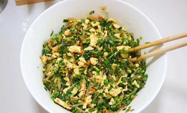 【食材】面粉、韭菜、粉条、鸡蛋、胡萝卜、盐、老抽、鸡精