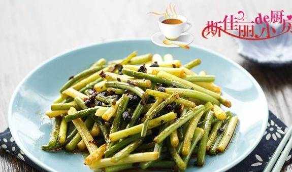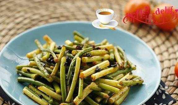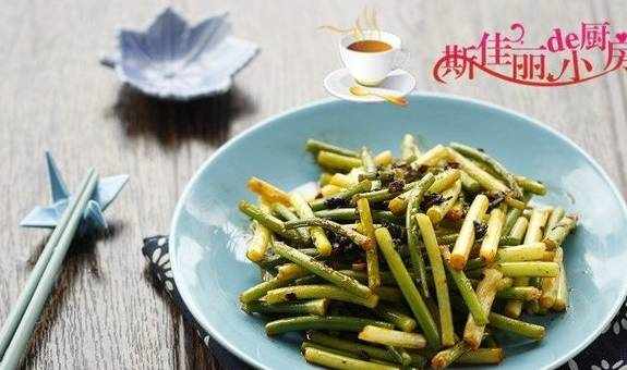 小贴士:1.焯蒜薹时加入点盐和油,能保持蒜薹的色泽;2.先煸炒下豆豉酱更能激发其香味。