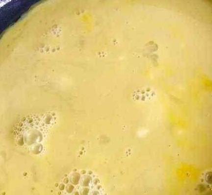 第四步、然后把鸡蛋液倒入锅中摊平,再煎一分钟