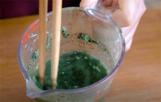 1.这个是220g的温水,里面倒上4g的酵母粉,15g的艾草粉放进去,用筷子搅匀。