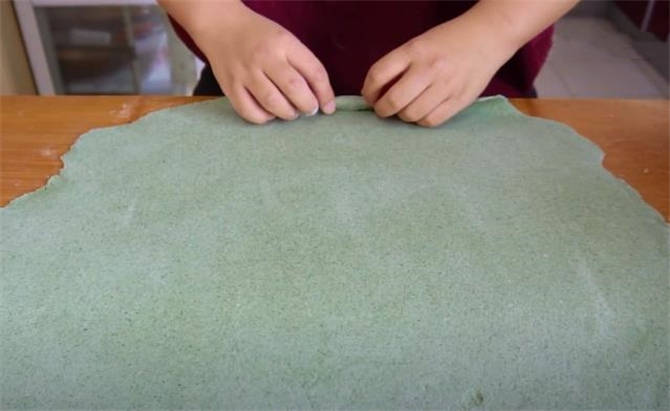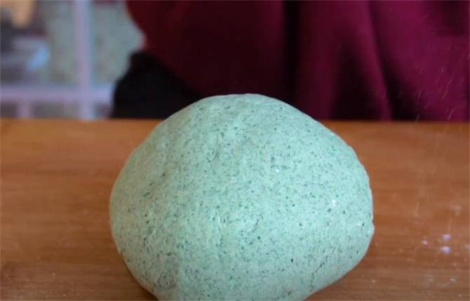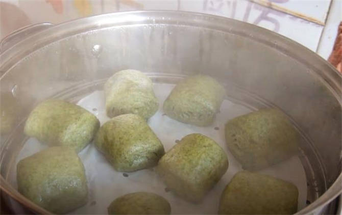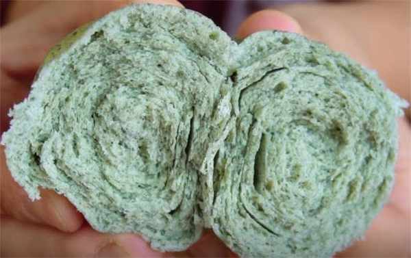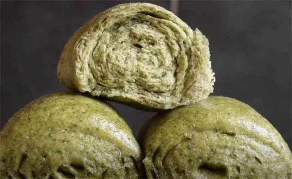 7.这个馒头的层次特别多,而且充满了艾草的清香味,一到春天的时候遍地都长满了艾草,大家可以采摘一点来和面,榨成泥,做成咱们这个艾草馒头。
