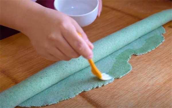 3.案板上撒一些干粉防粘,直接按扁了,擀成长方形的饼皮,擀好了之后,直接从底部卷起来。