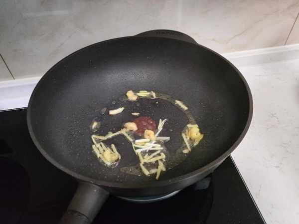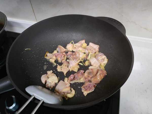 加入鸡块,迅速翻炒。多炒会儿,加适量酒、盐、酱油调味。