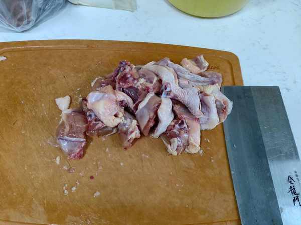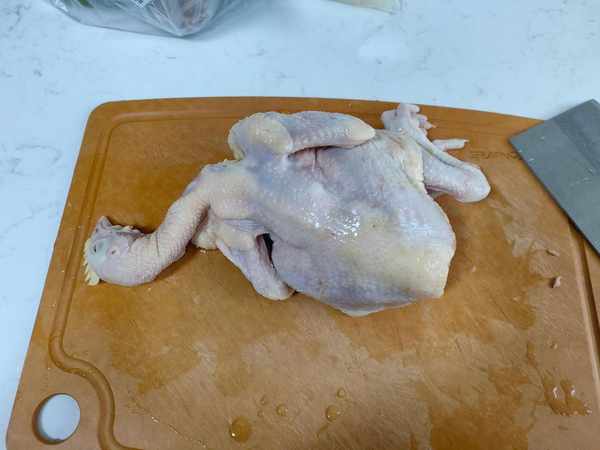 童子鸡拿到手的时候,就剖洗得很干净,稍微清洗一下,剪掉趾甲和鸡屁股,再切下半只。