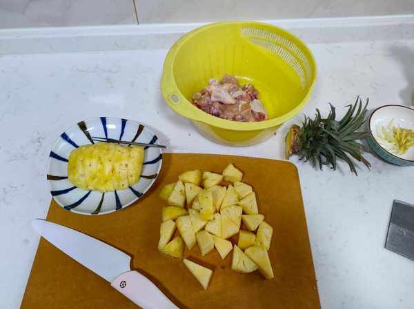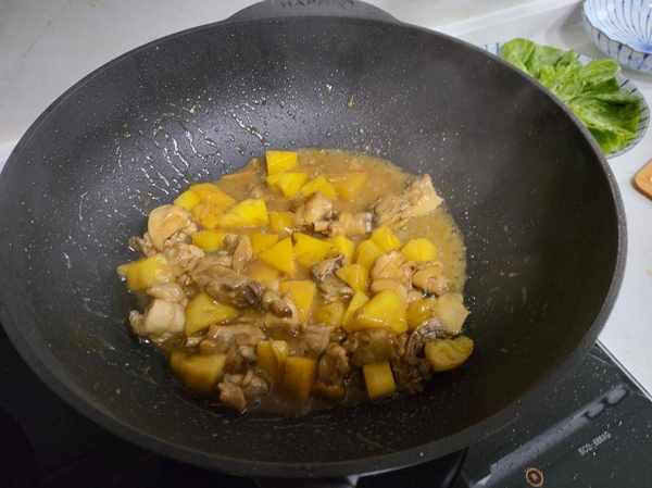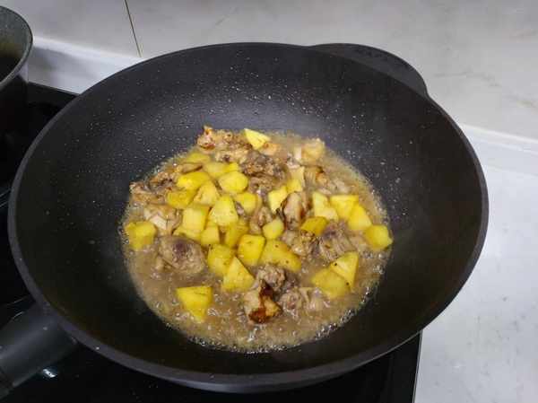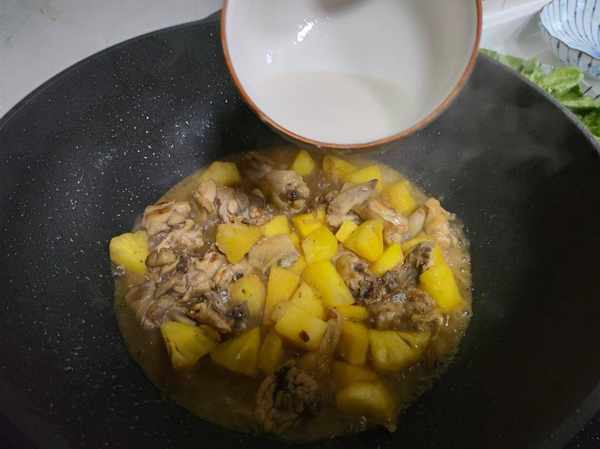 鸡块很容易炒熟的,加入凤梨,少许水,大火转小火,略煮一会儿,这样更入味。