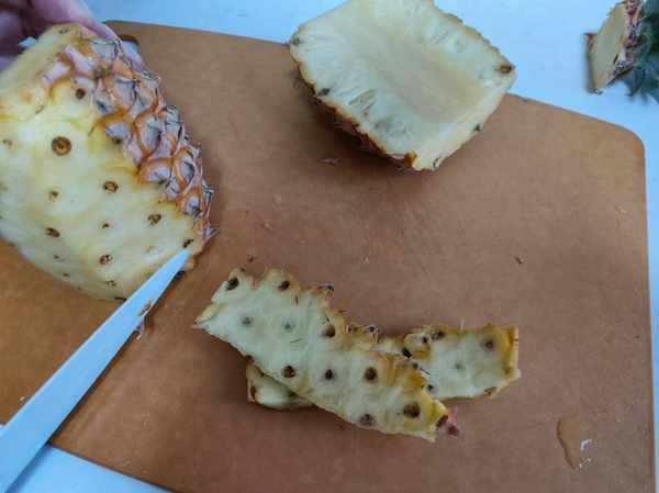 半个凤梨切块做菜,还有半个切片,直接吃。