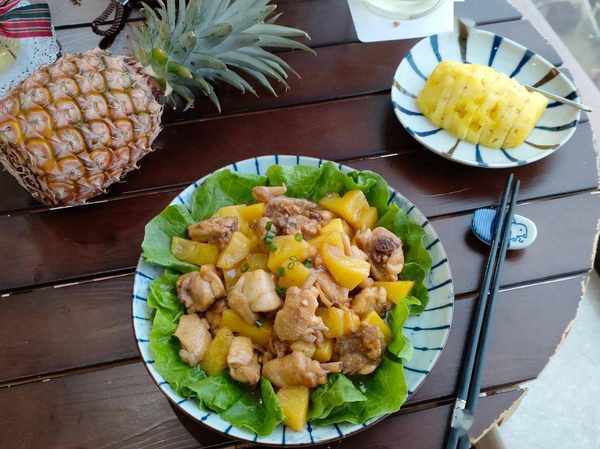 半个凤梨半只鸡,正好能炒一大盘。剩余的半个凤梨,也瞬间被我和老公一人一块抢光光,哈哈,太欢乐了!