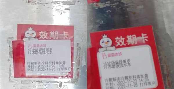 其中一名店员告诉记者,蜜雪冰城有明确规定不能使用过期食材,如果被公司区域管理人员发现,会对加盟店进行处罚,因此每天晚上打烊前,都要检查这些原材料,一旦发现过期原料,将更换效期卡。