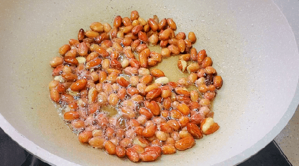3、凉锅凉油放进洗净的花生米,开小火慢慢把花生米炒熟,洗过的花生米炒的时候不容易炒糊,并且不脏油,炒熟会更加清脆美味,又香又脆特好吃。