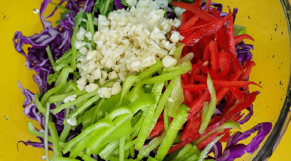 2、浸泡好的紫甘蓝清洗干净,洗去多余的盐分,捞出挤净水分,这一步是紫甘蓝清脆美味的关键。挤净水分的紫甘蓝放进大一点的盆中,倒进提前切好的青红辣椒丝,蒜末,香菜段备用。
